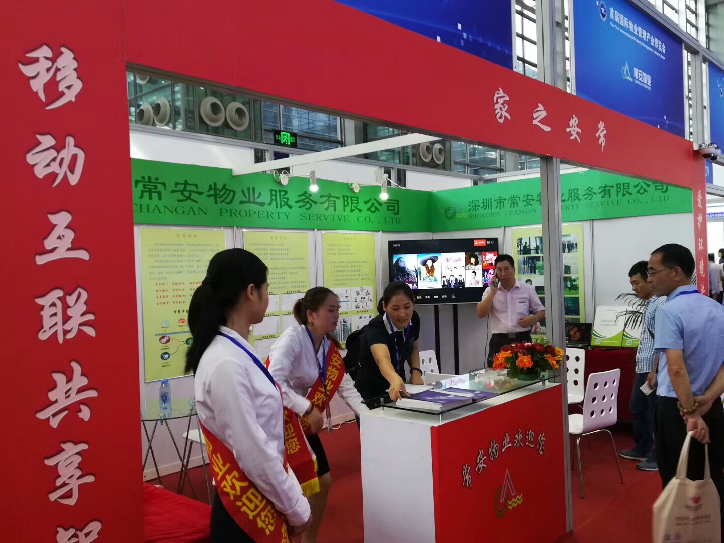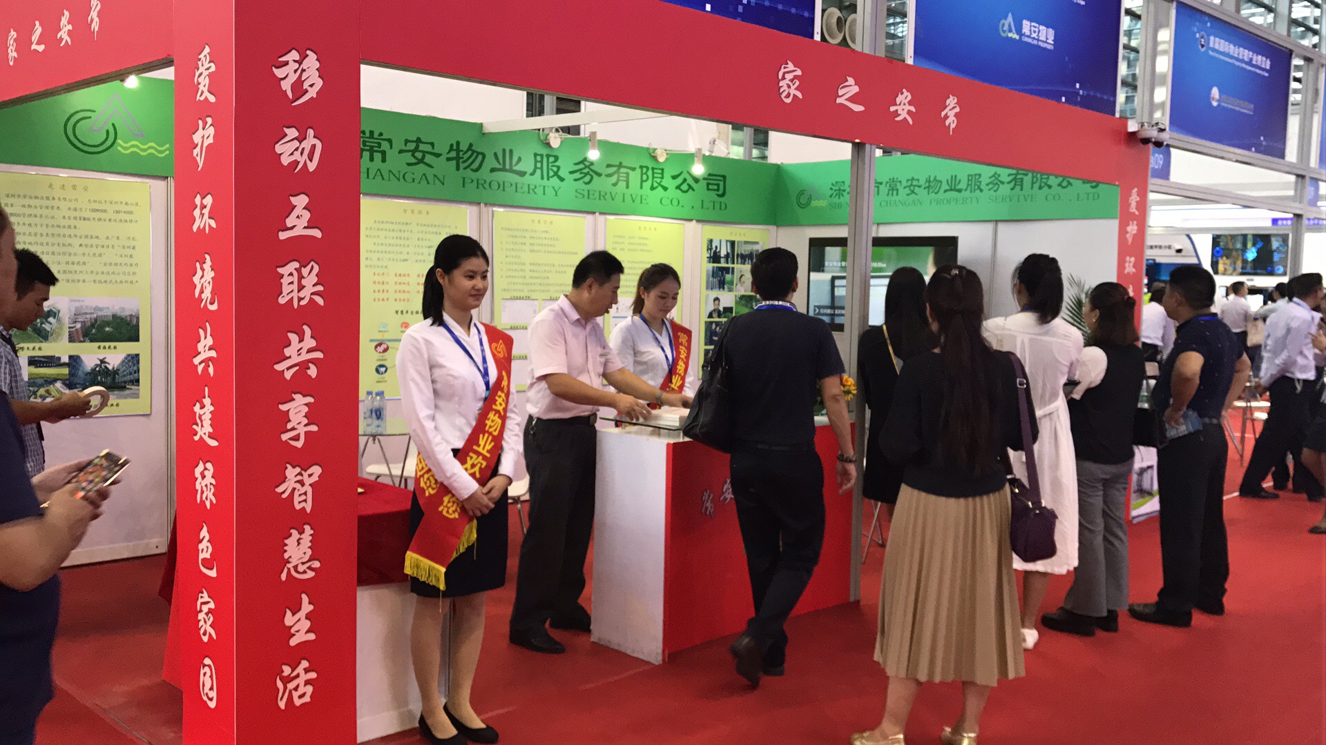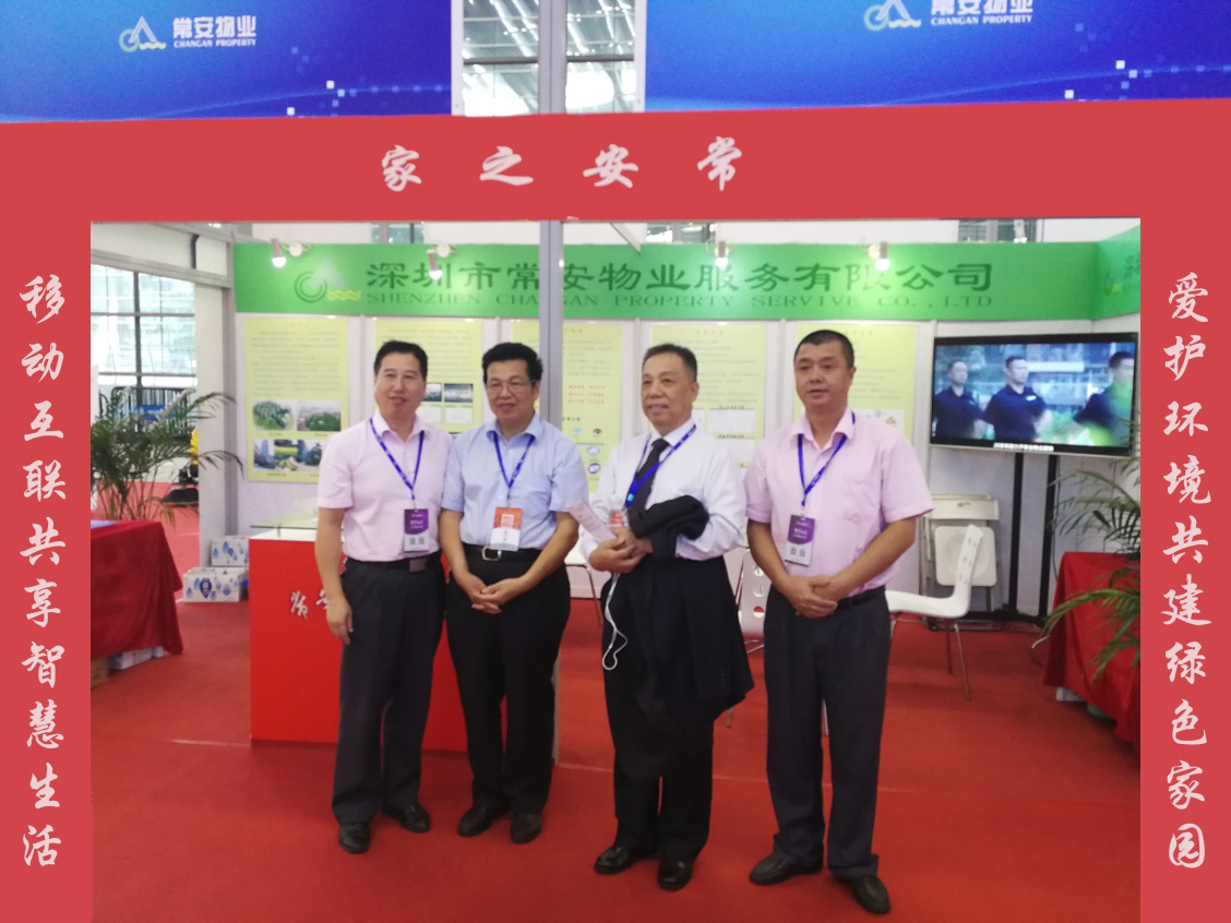中國(guó)物業(yè)管理協(xié)會(huì)會(huì)長(zhǎng)沈建忠及深圳市物業(yè)管理協(xié)會(huì)會(huì)長(zhǎng)曹陽(yáng)在常安物業(yè)公司展位前合影留戀