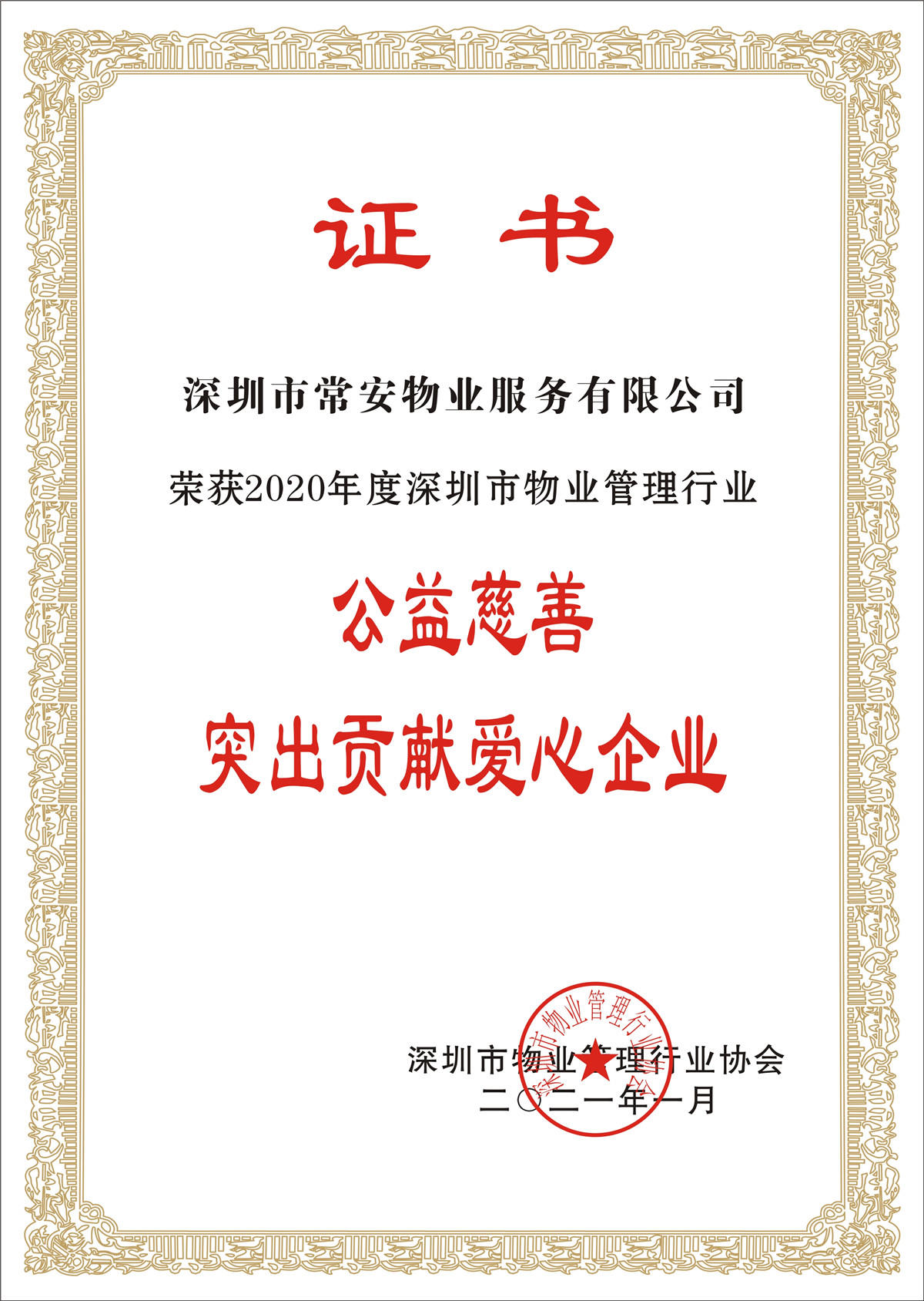 為貫徹國(guó)家脫貧攻堅(jiān)整體部署,響應(yīng)政府、行業(yè)黨委、協(xié)會(huì)等有關(guān)部門(mén)號(hào)召,在發(fā)展企業(yè)經(jīng)營(yíng)的同時(shí),深圳市常安物業(yè)服務(wù)有限公司弘揚(yáng)中華民族團(tuán)結(jié)互助、扶貧濟(jì)困的精神,積極履行自身的社會(huì)責(zé)任。為表彰常安物業(yè)在公益慈善方面的突出貢獻(xiàn),深圳市物業(yè)管理行業(yè)協(xié)會(huì)特授予常安物業(yè)“2020年度深圳市物業(yè)管理行業(yè)公益慈善突出貢獻(xiàn)愛(ài)心企業(yè)”榮譽(yù)稱(chēng)號(hào)。