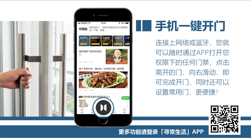 連接上網(wǎng)絡(luò)或藍(lán)牙,您就可以隨時(shí)通過APP打開您權(quán)限下的任何門禁,點(diǎn)擊需開的門,向右滑動(dòng),即可完成開門,同時(shí)還可以設(shè)置常用門,更便捷!